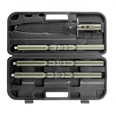 Épieu démontable constitué d'une dague inox avec une lame de 7 mm d'épaisseur et de trois tronçons pouvant être assemblés pour former un épieu de 177 cm.