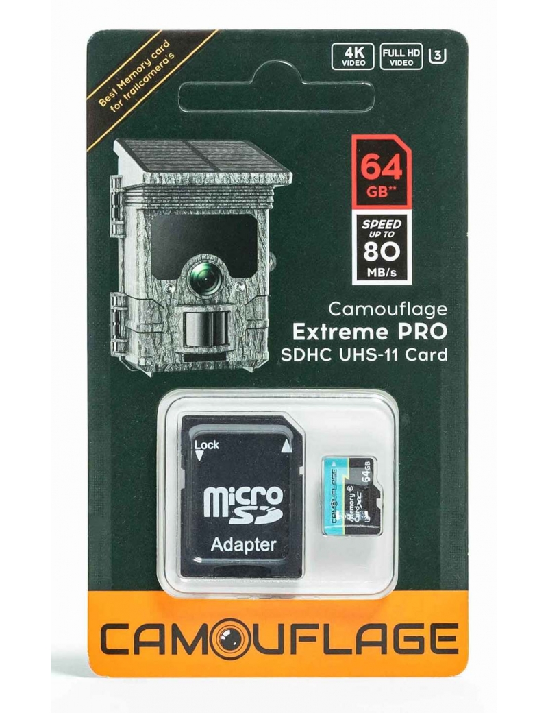 Optimisez les performances de votre caméra de chasse ou de surveillance avec la carte mémoire Camouflage Extreme PRO 64 Go. Conçue spécifiquement pour le plein air, elle offre une vitesse de transfert allant jusqu'à 80 MB/s, idéale pour l'enregistrement vidéo en 4K et Full HD. Livrée avec son adaptateur SD pour une compatibilité universelle.