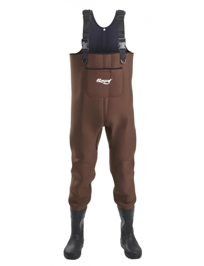 Équipé de bretelles réglables, d’une poche ventrale et de bottes en caoutchouc.