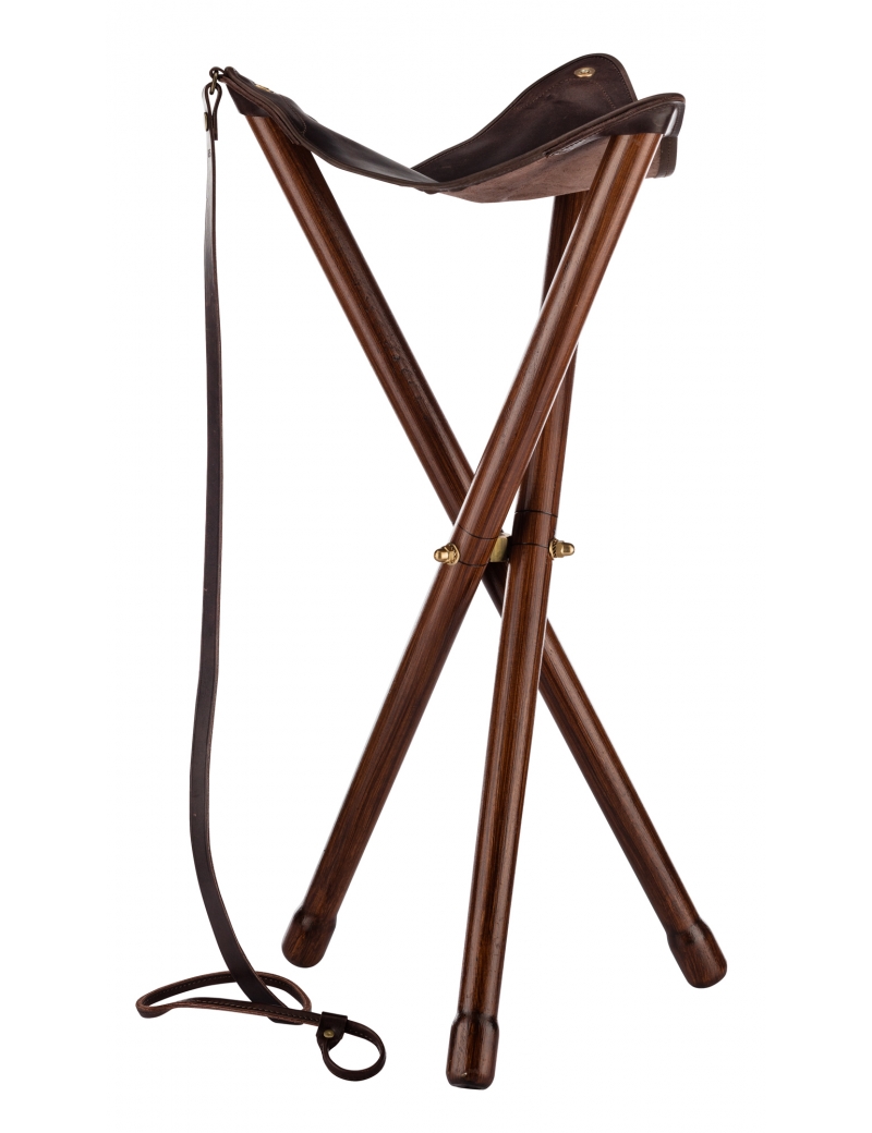 Les pieds sont en bois de la plus haute qualité. Le grand siège à ressorts est en cuir naturel. La chaise est équipée d'une sangle de sécurité pour le pliage des pieds et se porte facilement à l'épaule. La hauteur correspond à la longueur des pieds.